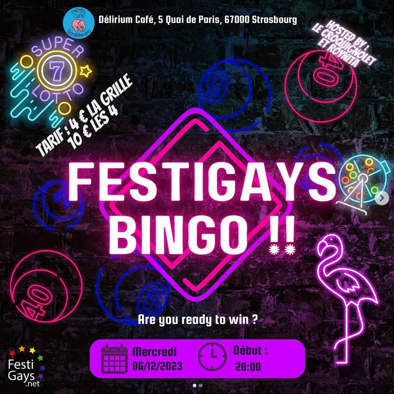 En l’honneur de la journée mondiale de lutte contre le VIH/Sida quelques jours avant, FestiGays vous invite au @deliriumcafestrasbourg le mercredi 06 décembre à partir de 20h pour son Bingo !