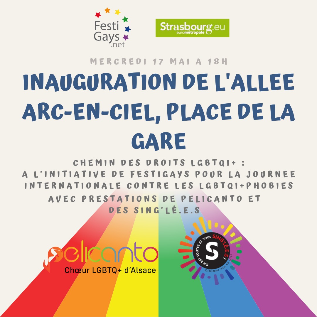 A l’occasion de la journée internationale de lutte contre les LGBTQI+phobies et du lancement du mois des visibilités, FestiGays et la mairie de Strasbourg vous convient à l’inauguration du chemin des droits LGBTQI+ le mercredi 17 mai à 18 heures sur la place de la gare !